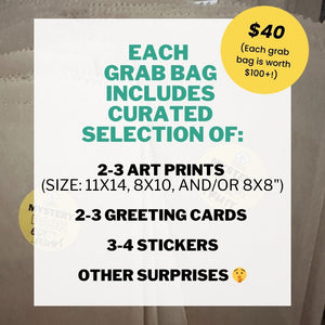 Each mystery pack contains products that were overstocked, discontinued, or had slightly-less-than-perfect printing.
